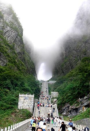 這里的山路99道彎 在懸空了二十四分鐘經(jīng)歷了奇險的8座山峰后,我們的心終于才踏踏實實的落到了地面上,到達了山頂。 山下晴朗山上雨。 乘坐在環(huán)保汽車上,透過車窗所能見到的似黛似玉的畫屏與絕壁千仞的壯觀;所能感受到的是蕩氣回腸的奇絕與如詩如畫的震撼。窗外仍然細雨蒙蒙,環(huán)保汽車繼續(xù)回旋在通天大道的彎道上,突然前面看不到公路的延伸,但車還在原速行駛,讓人多少有點害怕,誰知,在一個180度急轉彎后,環(huán)保車依然行駛在懸于半空的通天大道上,安然無恙。這大致就是通天大道的“絕”了,明明無路可走,誰知卻從一個讓你無法想象的角度把你的視線續(xù)接起來;赝幌,真是蠻有意境,象一條巨龍,攀附在山體,蜿蜒而上。 在我還在驚奇“通天大道”蜿延峻巡于群山絕壁之上的絕險感嘆 “通天大道”艱苦建筑于壁立萬傾之中的奇?zhèn)r,思路便被同伴雀躍的歡呼拉回!翱吹教扉T洞了!”。 999級的上天梯,有清代俞良模的提詞:莫謂山高空仰止此中真有上天梯?磥硐胍上蛇真得經(jīng)歷一翻磨難的。做了幾個深呼吸,開始爬上天梯,天門洞已經(jīng)呈現(xiàn):南北對開,大約150米左右高、氣勢磅礴,巍峨高絕,有團團云霧自洞中吐納翻涌,瑰麗神奇,宛如幻境。大約2平方公里的山頂,視野廣闊,往下看去,山在云中動,云附山體游,飄飄然的,還真有點仙人的感覺。洞口的風很大,這雨形成一大塊的雨屏,跟隨洞口來風改變著方向,肆意刮著,落在臉上很舒服…… 天門山是一幅濃墨淡彩的山水水墨畫,需要你慢慢品味…… |