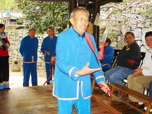 三棒鼓,是以拋三根棒和敲鑼打鼓得名,是土家山寨到處可見的一項(xiàng)以打擊樂器、口頭文學(xué)、表演技藝合為一體的文體活動(dòng)形式。 打三棒鼓通常由三至五人組成,師傅擊鼓唱詞,一人打鑼,一人;ò簟⒒ǖ。由一人表演,將鼓架擺在前面鼓架上,將鑼掛在鼓架下面,用細(xì)繩系著鑼棒套在腳板上,表演時(shí),口唱詞、手打鼓、腳踩鑼,鑼鼓節(jié)拍是按拋花棒、花刀速度的需要而定。三棒鼓的唱詞是五言四句重復(fù)半句組成。即五字一句,四句為一節(jié)。每小節(jié)的第四句要重復(fù)半句。每一小節(jié)擊響鑼鼓四遍。前三句是每唱完擊三響,最后一句唱完即每小節(jié)結(jié)束時(shí)擊響十下。例如唱:"學(xué)打三棒鼓",打"鏘鏘鏘";唱"學(xué)又學(xué)得苦",打"鏘鏘鏘";唱"三歲學(xué)到一十五",打"鏘鏘鏘";唱"學(xué)起呀,學(xué)起走江湖",打"鏘鏘鏘、鏘、鏘、鏘鏘鏘鏘鏘-鏘"。這一小節(jié),每唱一字為一拍,"鏘"為鑼鼓同鳴聲,每聲占一拍,標(biāo)點(diǎn)符號(hào)也占一拍。每拍的快慢取決于花棒下落的速度,任何一個(gè)花棒下落一次均為一拍。因此,如果花棒拋得低,下落的頻率就快,每拍所占時(shí)間就短,反之,花棒拋得高,每拍占的時(shí)間就長。三棒鼓的第二句和第四句都要求壓韻,一句和三句可壓可不壓. 打三棒鼓的技巧性很強(qiáng),思想要高度集中,拋刀拋棒用力要適度,動(dòng)作要敏捷準(zhǔn)確,稍有疏忽大意,不但表演失敗,還會(huì)被刀劃破手腳或誤傷他人。因此,凡是學(xué)打三棒鼓者,均需經(jīng)常練習(xí)飛拋接技術(shù),做到閉目均能拋接刀棒。因此,土家族青少年經(jīng)常用三個(gè)卵石練習(xí)拋接技術(shù),久而久之,熟能生巧,不但會(huì)拋棒,而且能拋刀。 打三棒鼓的鑼鼓曲牌不變,但唱詞多種多樣,除了固定的《十二月花》等唱詞外,均為即興編詞隨口而唱,唱三棒鼓歌的人,都是腦筋靈活、口才伶俐者。 |