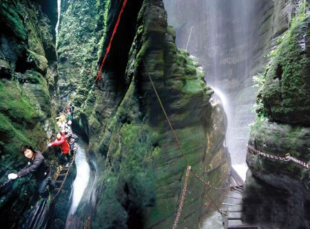坐龍峽圖片 坐龍峽風景區(qū)位于古丈縣河西鎮(zhèn),與“芙蓉鎮(zhèn)”--王村一水之隔。經(jīng)由300萬年大自然的風吹、水蝕而成,一直隱逸于湘西茫茫十萬群山之中。它長約3500米,最大高差達300余米;寬處不足丈余,窄處僅容一人通過;谷內(nèi)絕壁縱疊,溪瀑橫懸,崖樹斜逸,異草遍坡。