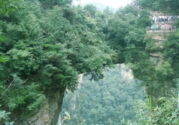 張家界天下第一橋 “天下第一橋”。橋長20米,寬僅1.5至3米不等,但較平坦,可通行人。橋上蒼松挺拔,橋下云霧蕩漾,萬丈深淵。四周懸崖絕壁,水滴飛濺。踏上橋面,使人有凌空御風(fēng)之感。手扶鐵欄桿,仰視,青峰飄渺于云靄繚繞之中;俯瞰,奇峰如筍群,巖壑深谷中陣陣煙嵐泛起,散而復(fù)聚。這里是張家界風(fēng)景一絕,是大自然的一個(gè)奇跡。您看,兩座山峰被一條長廊連在一起,形成天然橋洞,平時(shí)吞云吐霧,氣勢壯觀雄奇.橋面寬約兩米,長20余米,絕對高度350米。橋上蒼松挺拔,橋邊古藤垂掛,橋下深不可測。遠(yuǎn)觀此橋,云霧繚繞,橋身若隱若現(xiàn),好似水中倒影一般。走在橋上,只見霧氣蒸騰,松濤呼嘯,石橋好像也顫顫悠悠,晃晃搖搖似的,令人驚心動魂。這里是張家界風(fēng)景一絕,是大自然的一個(gè)奇跡。