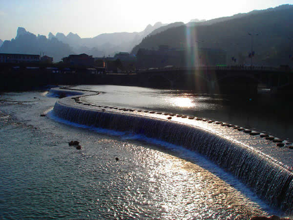 索溪峪的水 索溪峪的景觀,以山水為依托。不僅山奇、水秀,而且橋險、洞幽。有十里畫廊、西海峰林、百丈峽、寶峰湖、黃龍洞、一線天等游覽點300多個。