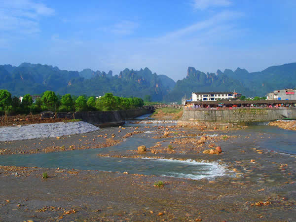 由于處于砂巖與石灰?guī)r交接處和峰林地貌比較發(fā)育,索溪峪的山?jīng)]有張家界那么峭峻,但卻也巍巍層列,站在索溪鎮(zhèn)或進入“十里畫廊”、“西海峰林”等觀景區(qū),只見深溝幽谷中的石峰,一座簇擁著一座,綿延一、二十里,尤如一幅水墨長卷,煞是壯觀。山坳溪水旁,農(nóng)舍散落,雞犬啼鳴,房頂?shù)拇稛熝U裊,屋旁亭亭修竹,使得這里雄奇中透著清秀,幽深中帶著恬淡,粗獷中含著嬌媚,給人以心曠神怡之感。