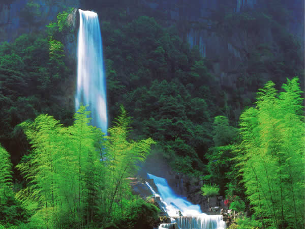 寶峰湖瀑布 湖中有兩座疊翠小島,近岸奇峰屹立,峰回水轉(zhuǎn)。泛舟漫游,只見一湖綠水半湖倒影,充滿詩(shī)情畫意!霸铺萑f(wàn)丈上天臺(tái),高峽平湖一鑒開,王母瑤池金扶,浣沙仙女下凡來(lái)”游寶峰湖,你就會(huì)欣賞到這樣的詩(shī)情畫意。群峰擁抱的寶峰湖,長(zhǎng)約2.,5公里,湖猶如一面寶鏡,四面青山,一泓碧水,蕩槳溫游,格外愜意。坐在船上,環(huán)顧四周,千山聳翠,俯視水中,倒影慢移,碧水照相館得群峰綠,人面桃花水映紅。真是靜極了,美極了!韓劇《九天洞》拍攝的湖水就是寶峰湖。