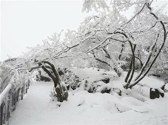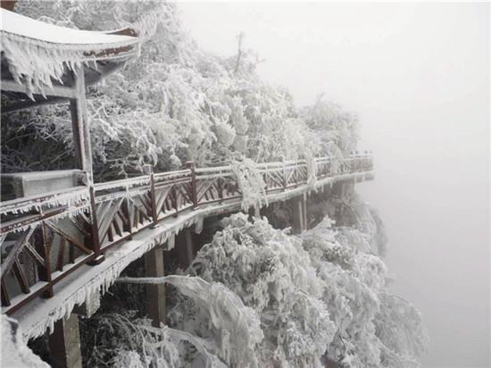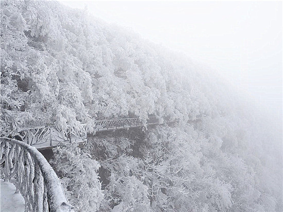 山頂上樹林不見(jiàn)了,取而代之的是形態(tài)各異的雪凇、冰掛;林間游道上覆蓋了厚厚的白雪,踩上去咯吱作響;絕壁上的棧道雪白一片,仿若是一條仙境之路...游客們玩雪、賞雪不亦樂(lè)乎。