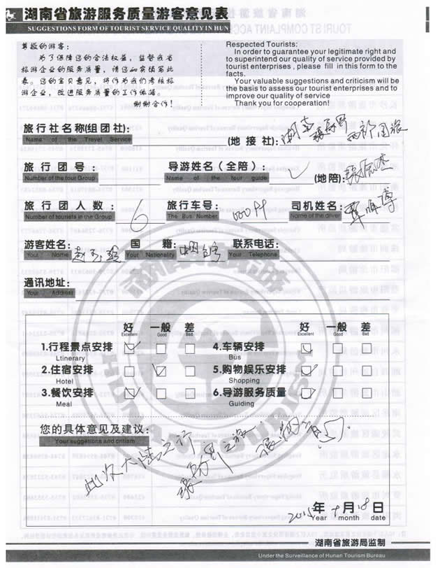 5月份,臺灣趙女士一行6位貴賓與湖南西部(張家界)中國國際旅行社工作人員——小龔取得聯(lián)系,經(jīng)過商談,雙方達成協(xié)議并簽訂旅游合同,于9月12日抵達張家界,開始張家界之旅。此次行程是由我社優(yōu)秀導(dǎo)游——張杰負責旅游接待工作,張導(dǎo)在旅游過程中講解詳細,客人也很滿意,在意見表上寫道:此次大陸之行、張家界之旅、很滿意。同時也感謝趙女士一行貴賓選擇湖南西部(張家界)中國國際旅行社,以及您對湖南西部國旅的信任與支持。我們會繼續(xù)努力,做好旅游接待工作。期待下一次與您的合作,祝您愉快!