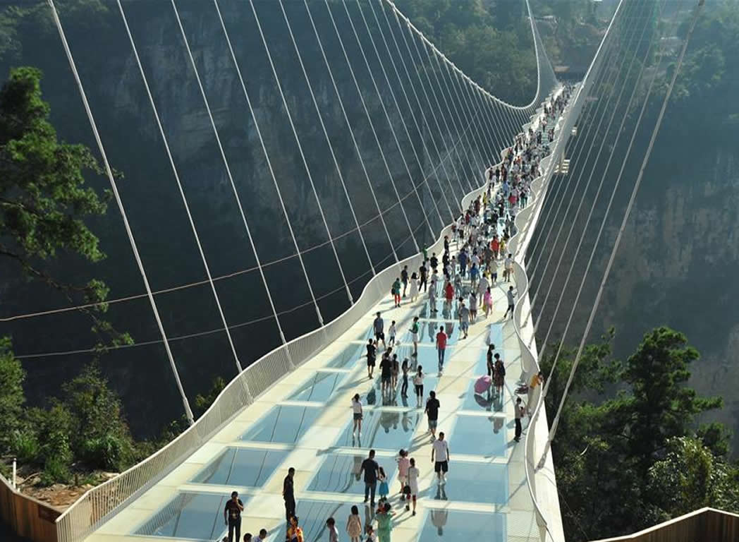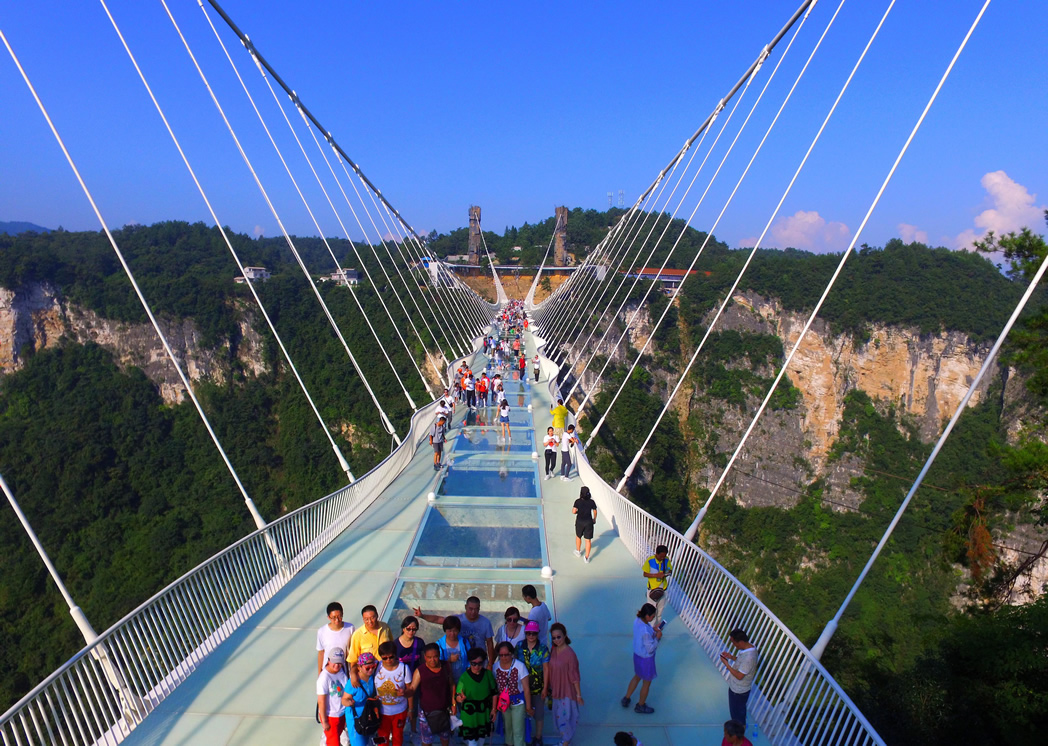 張家界大峽谷玻璃橋位于湖南省的張家界大峽谷景區(qū)栗樹(shù)埡和吳王坡區(qū)域內(nèi),為一座景觀橋梁,兼具景區(qū)行人通行、游覽、蹦極、溜索、T臺(tái)等功能。主跨430米,一跨過(guò)峽谷,橋面長(zhǎng)375米,寬6米,橋面距谷底相對(duì)高度約300米。這座全透明玻璃橋長(zhǎng)度、高度位居世界第一。