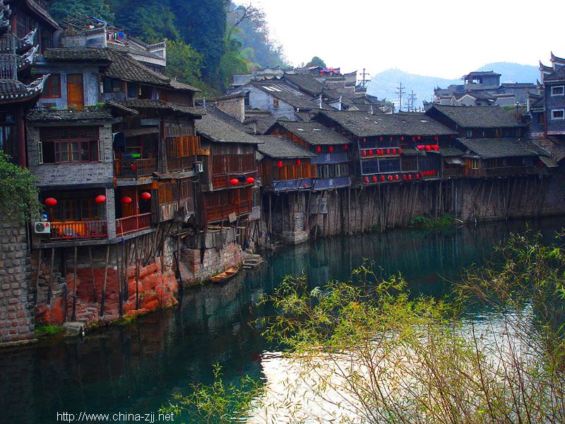 【鳳凰古城位于沱江之畔、群山環(huán)抱、關(guān)隘雄奇、碧綠的沱江依著城墻緩緩流淌,疊翠的南華山麓倒映江中,江中漁舟游船數(shù)點(diǎn),山間暮鼓晨鐘兼鳴,懸崖上的吊腳樓輕煙裊裊,碼頭邊的浣紗姑笑聲朗朗,兩岸已有數(shù)百年歷史的吊腳樓更是別有一番風(fēng)味;順?biāo)麓┻^虹橋一幅江南水鄉(xiāng)的畫面便展現(xiàn)于眼前--萬壽宮、萬名塔、奪翠樓……一種遠(yuǎn)離塵世的感覺悠然而生;鳳凰--猶如“一幅濃墨淺彩的中國山水畫”】